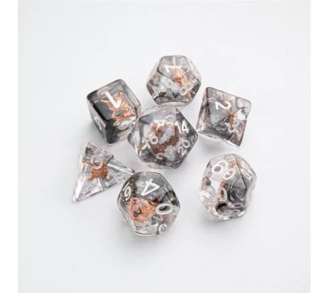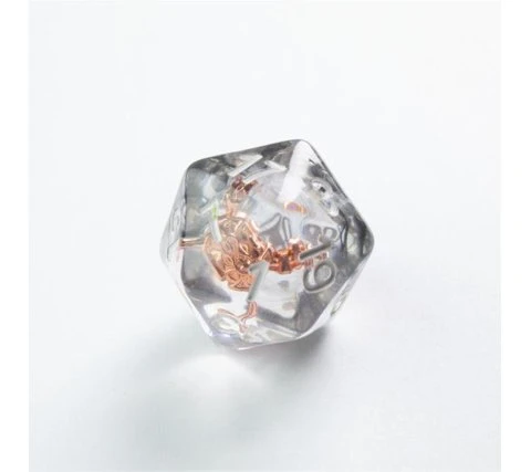 The Embraced Series dice are made of crystal clear resin with a fun or attractive object incorporated. The objects range from a ghost ship to a rubber duck. With these dice you really bring something unique to the table. Will your two-meter-tall muscular Barbarian be rolling rubber ducks soon?