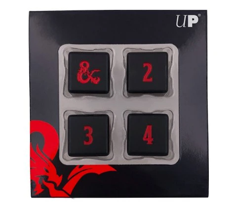 This set contains four six-sided dice (D6) with a random number pattern. The color of the dice is black with red colored numbers and symbols. The number 6 on the die has been replaced by a Dungeons & Dragons symbol.