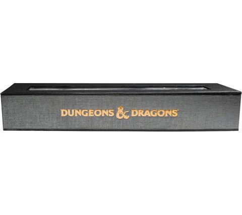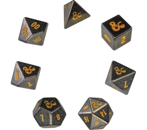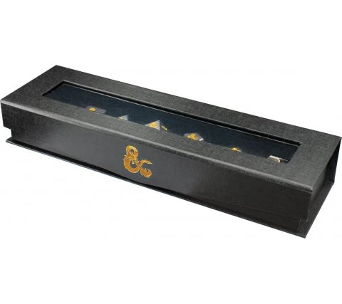 This set of seven different Dungeons & Dragons heavy metal dice includes a four-sided die (D4), a six-sided die (D6), an eight-sided die (D8), ten-sided die (D10), a twelve-sided die (D12), a twenty-sided die (D20), and a ten-sided die with tens (D10%). The color of the dice is meteorite black with orange colored numbers and symbols. The highest number on the die has been replaced by a Dungeons & Dragons symbol. The set comes in a luxury storage box with Dungeons & Dragons print.